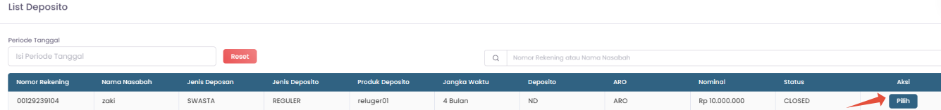 5. Lalu cari nasabah yang ingin melakukan transaksi pencairan bunga deposito dengan klik tombol "Cari" dan klik "Pilih" untul norek yang dituju.