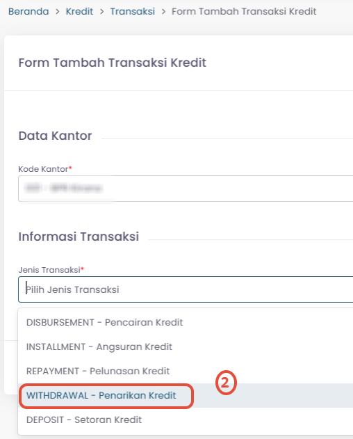 4. Pada "Form Tambah Transaksi Kredit" , pilih jenis transaksi "Penarikan Kredit"